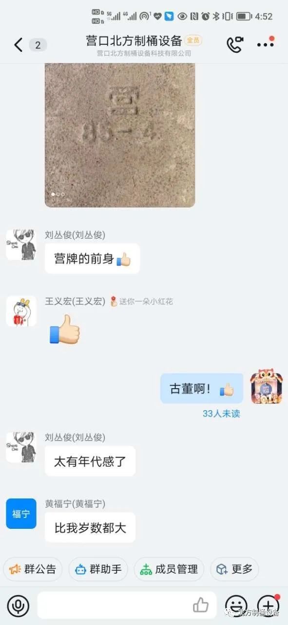 原來,小黃在前幾天參加公司年終表彰大會的時候,聆聽了老師傅們和慕總講述的“營牌”起源的故事,一直印象深刻。過年回到錦州老家,發(fā)現(xiàn)自家院子里有一個舊桶,便尋找起“營”字,幸運的是,真的被他找到了!于是他激動的把照片發(fā)到釘釘群里,同事們看到照片激動不已,滿屏的點贊,大家紛紛說太牛了,是咱們營牌鋼桶真正的歷史見證,很多年輕同事們都感慨說道,這只鋼桶比自己年紀都要大!