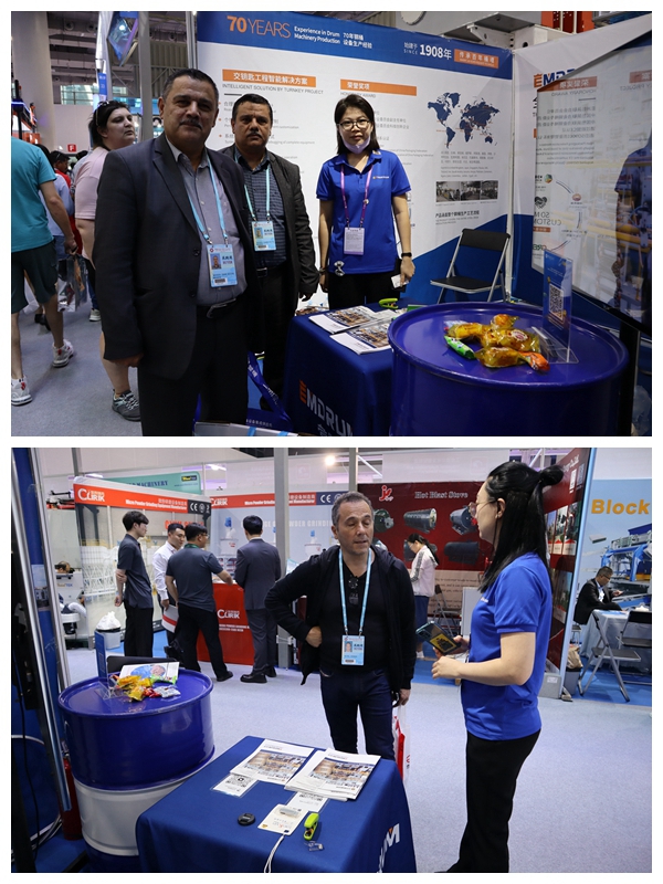 北方制桶在位于D區20.1 F35展位共接待了國內外客人近60余人, 主要來訪客戶來自“一帶一路”共建國家,其中多位客人在展會現場立即與參展員工現場溝通鋼桶生產線的配置細節并有意向到營口北方制桶設備工廠實地考察,詳細討論布局方案等技術細節。